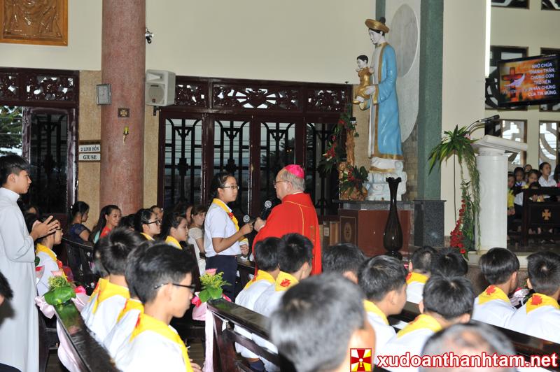 Đức Cha đã mở đầu bài giảng bằng các câu hỏi về Chúa Thánh Thần. Các em cũng đã mạnh dạn trả lời những câu hỏi “tưởng dễ mà chẳng dễ chút nào” của Đức Cha trong tinh thần học hỏi và bầu khí vui tươi, đã làm Đức Cha rất hài lòng. Nói về Chúa Thánh Thần, ngài nhắc các em hãy sống trong Thần Khí Chúa để được thuộc về Chúa Kitô và lãnh nhận sức mạnh của Chúa Thánh Thần, từ đó có lòng vị tha, lòng thương xót với tha nhân như sách Tin Mừng loan báo.